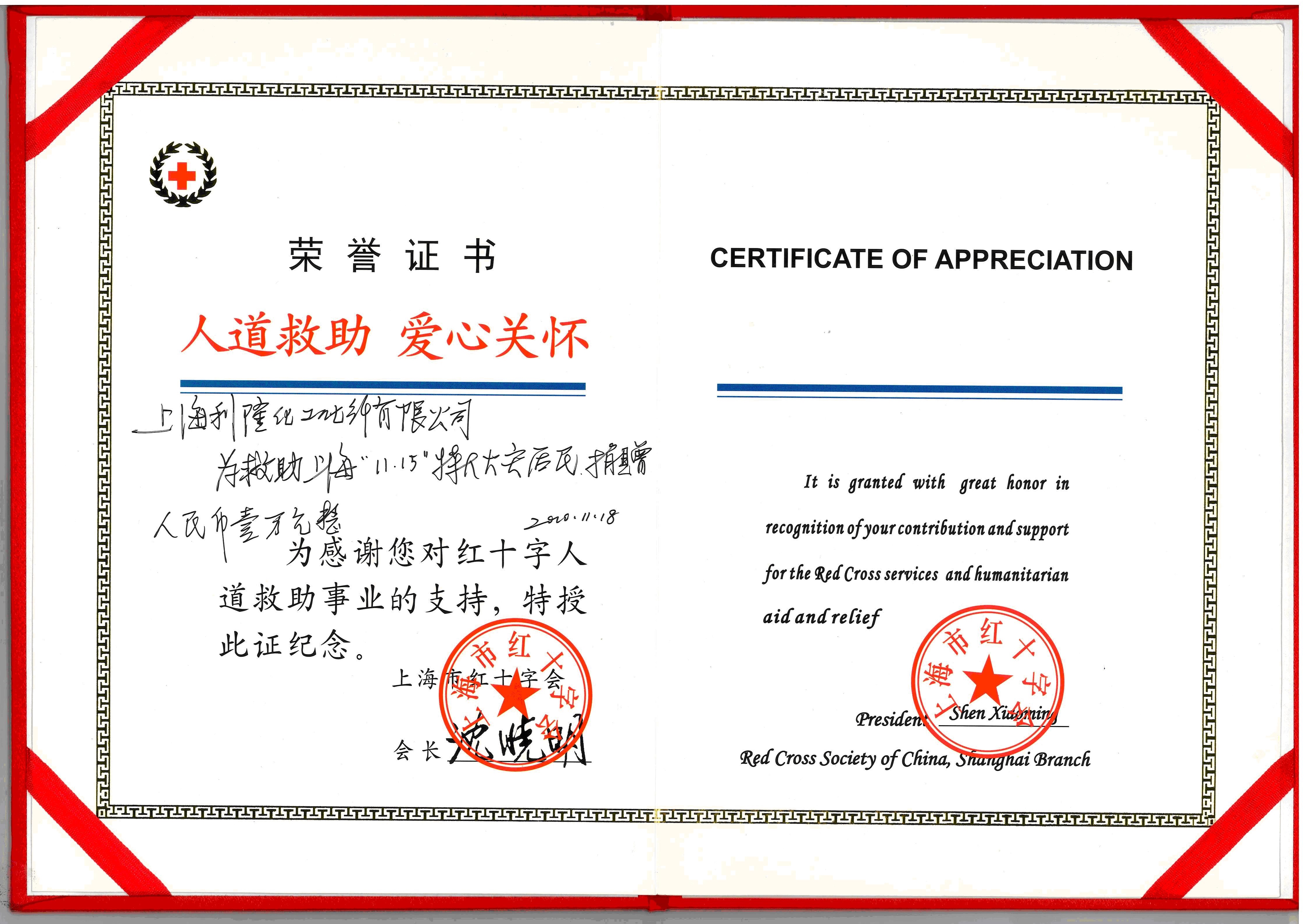 红十字捐赠证书