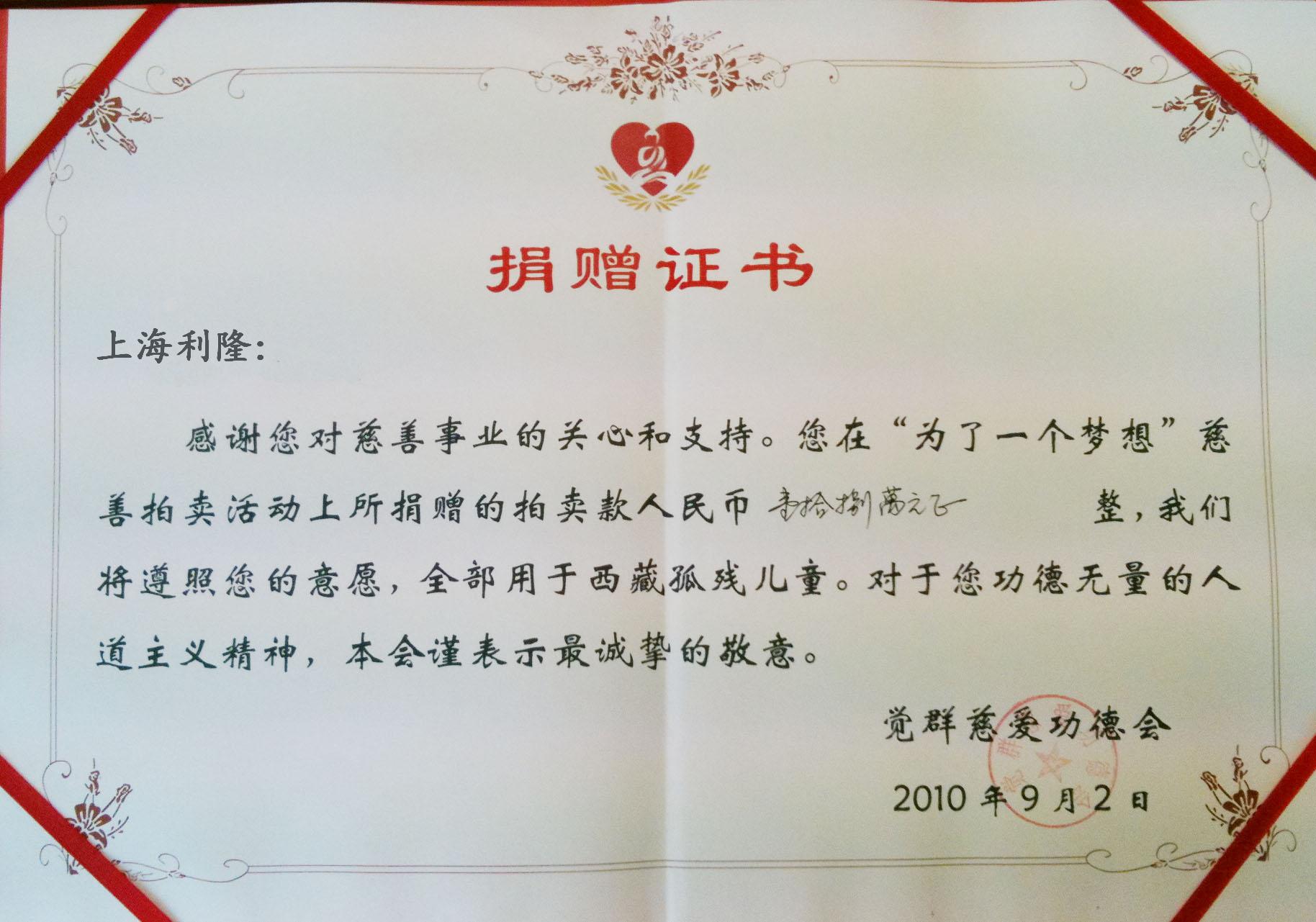 觉群慈爱功德会捐赠证书