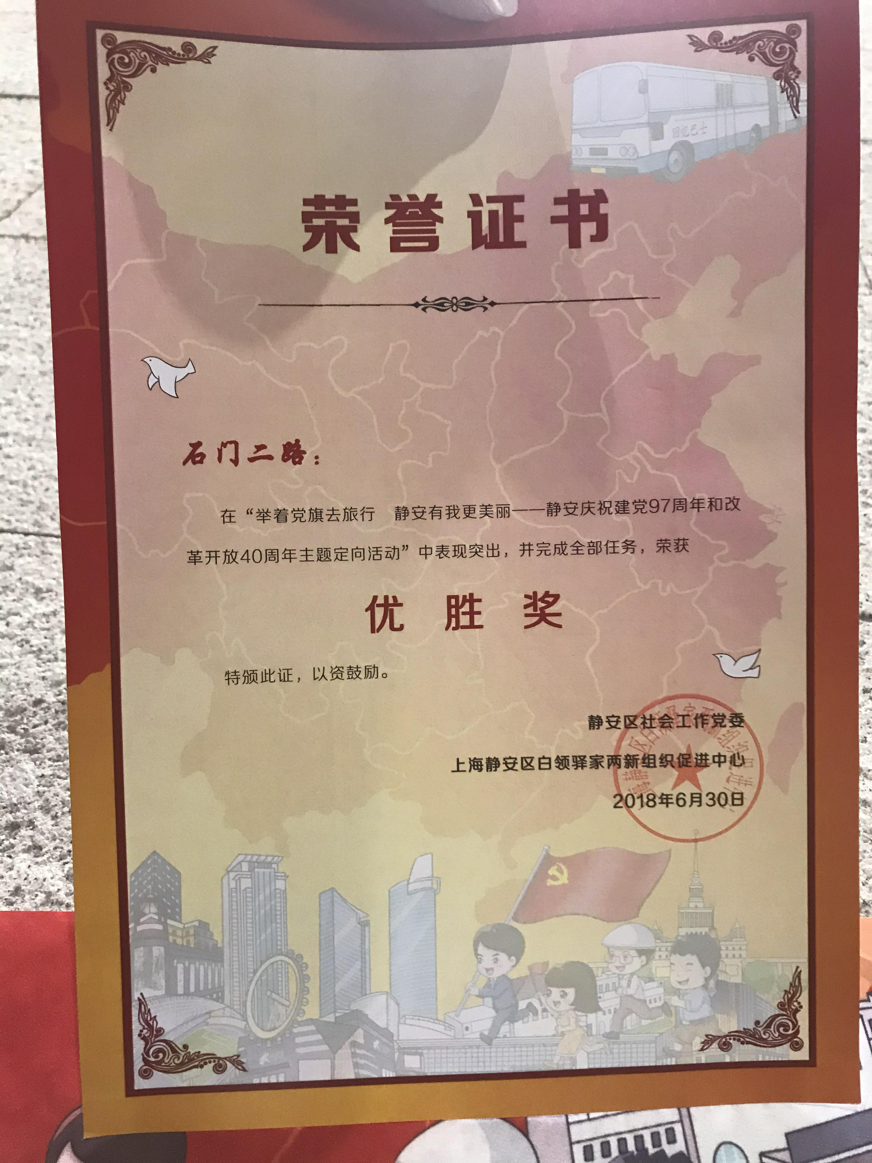 “举着党旗去旅行 静安有我更美丽 静安庆祝建党97周年和改革开放40周年主题定向活动”优胜奖