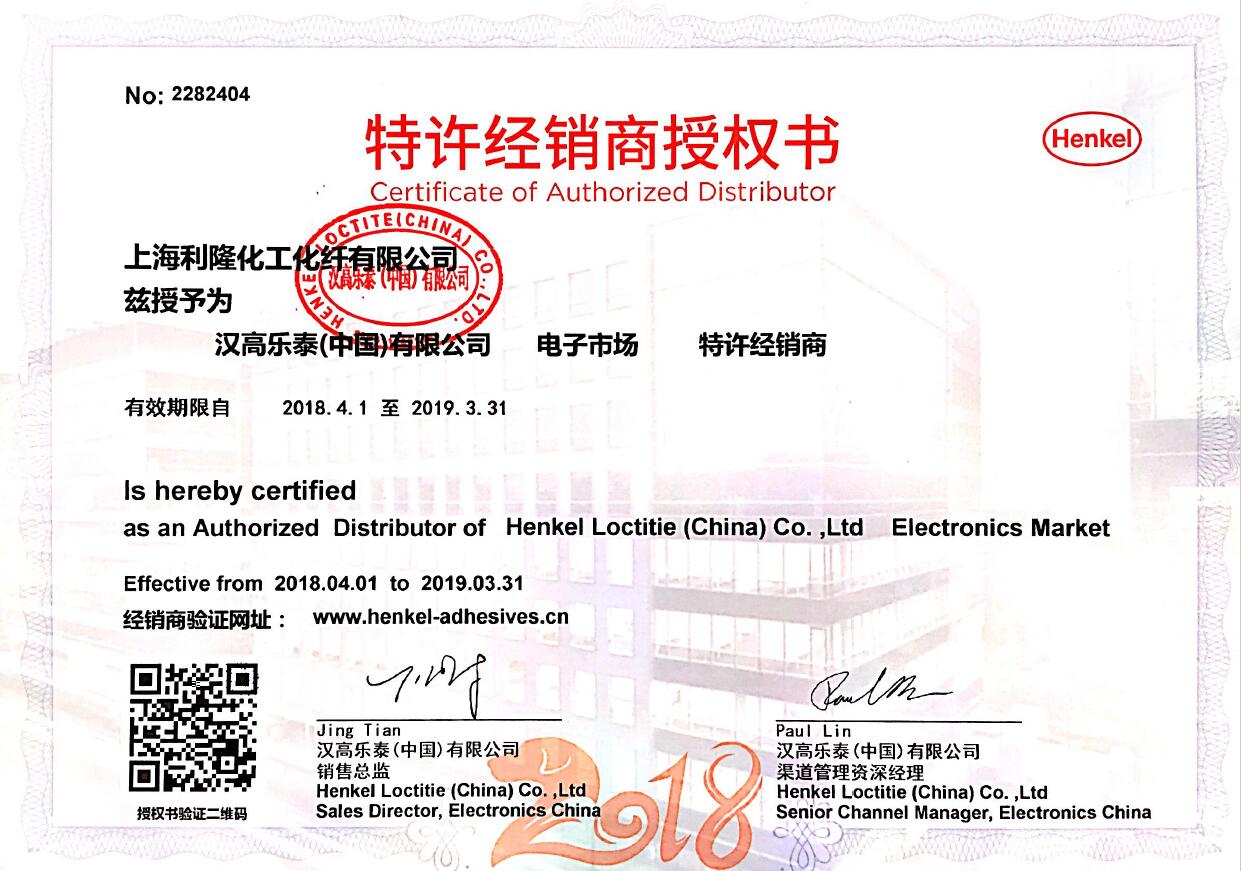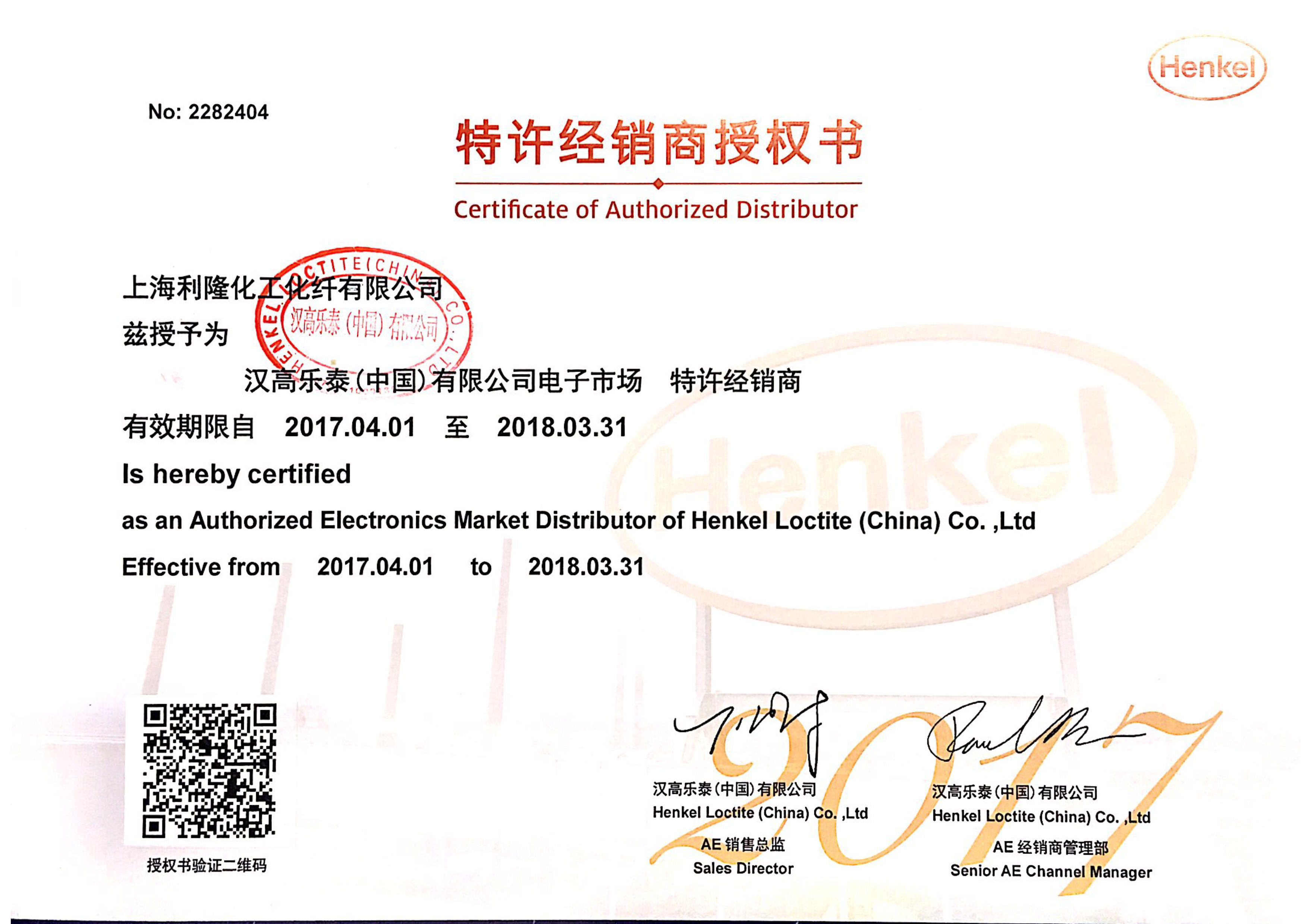 2017-2018年度汉高授权证书