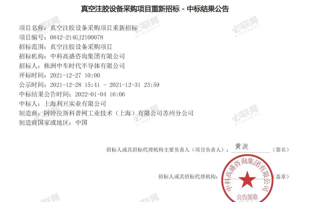 中标公告-株洲中车时代半导体有限公司真空注胶设备