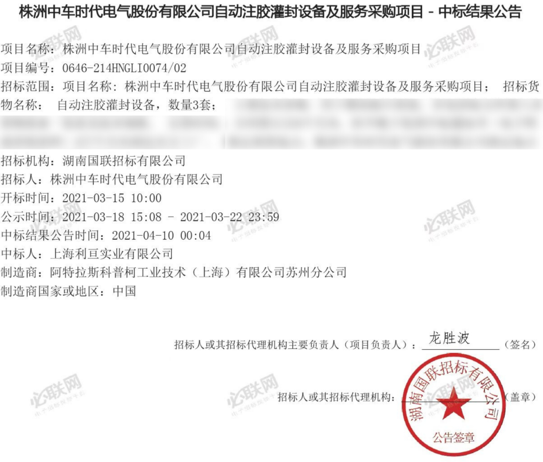 中标公告-株洲中车时代电气股份有限公司自动注胶灌封设备及服务