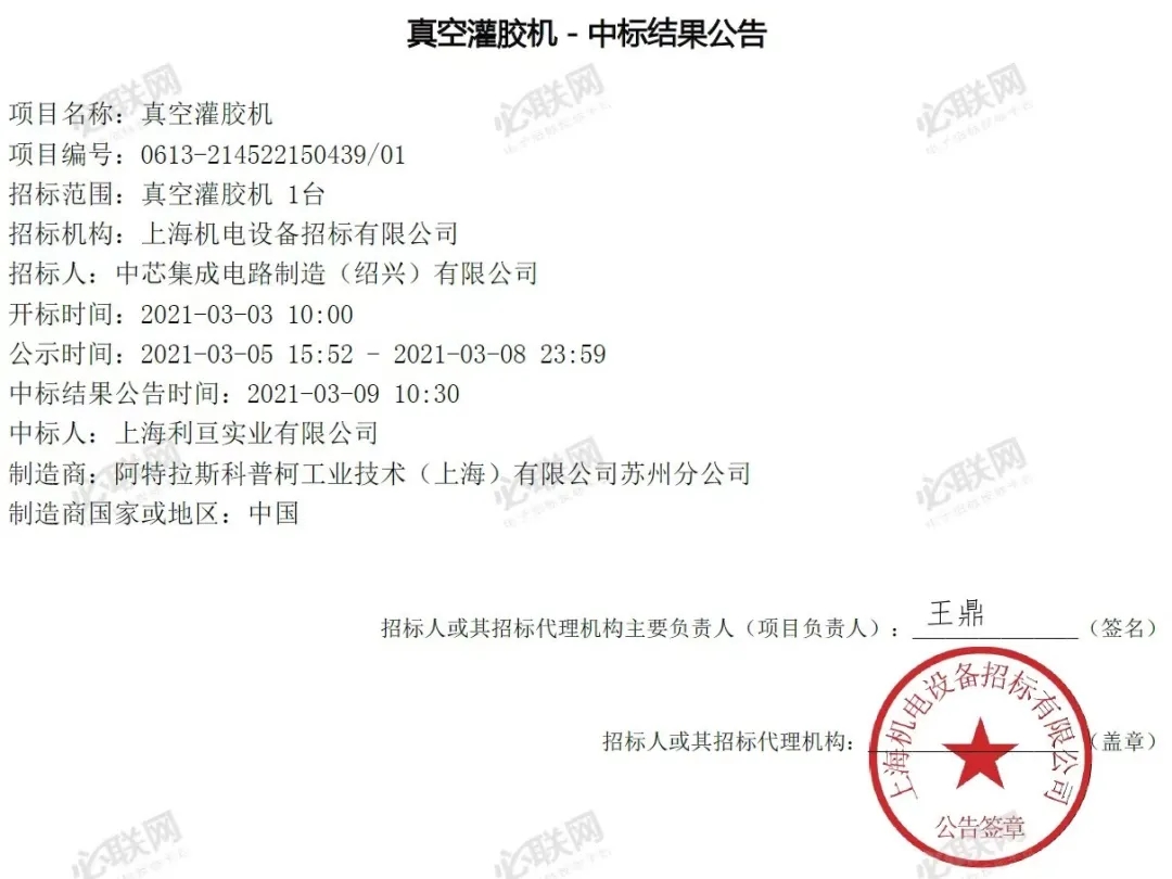 中标公告-中芯集成电路制造(绍兴)有限公司真空灌胶机