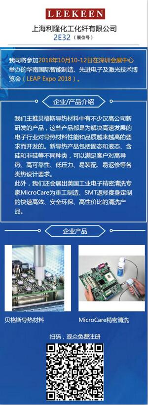 上海利隆化工化纤有限公司邀您参加于10月10日至12日在深圳会展中心召开的LEAP Expo 2018华南国际智能制造、先进电子及激光技术博览会!