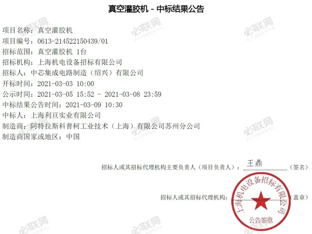 热烈祝贺上海利隆旗下上海利亘实业有限公司于2021年3月喜中中芯集成电路制造(绍兴)有限公司真空灌胶机项目