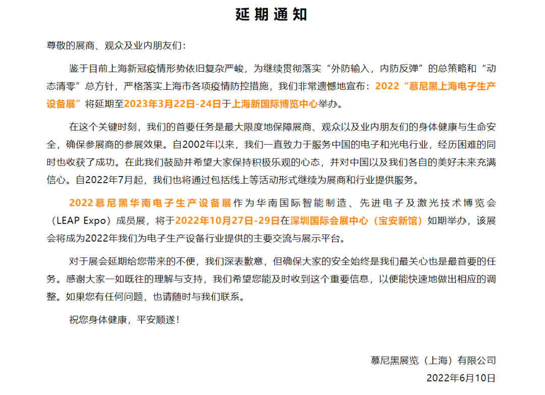 关于2022“慕尼黑上海电子生产设备展”延期通知