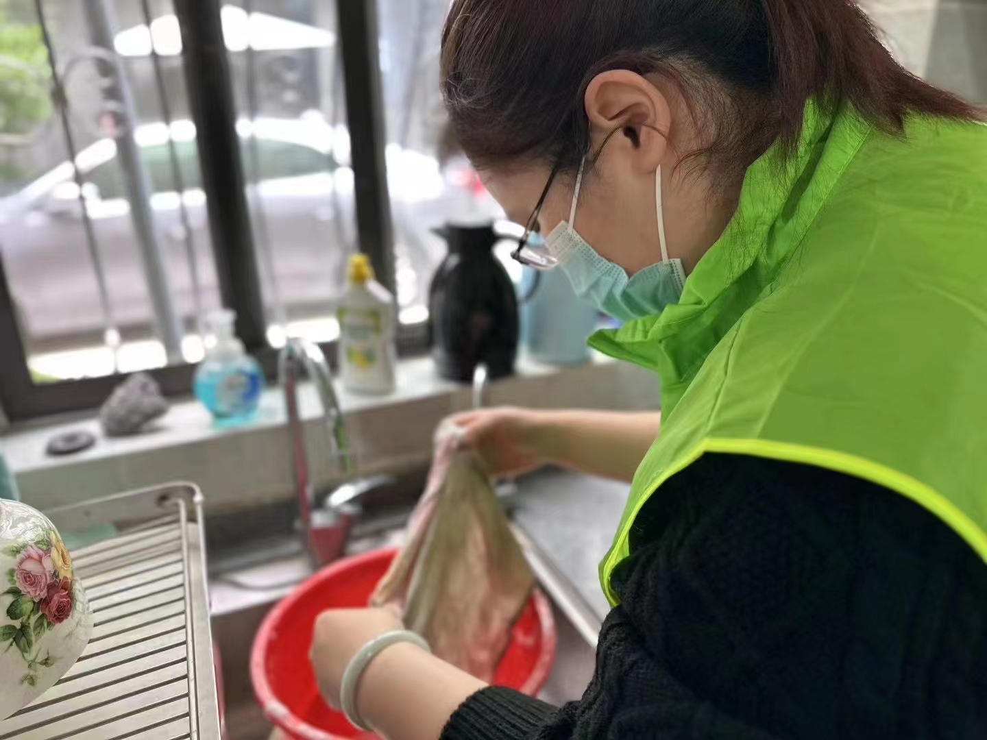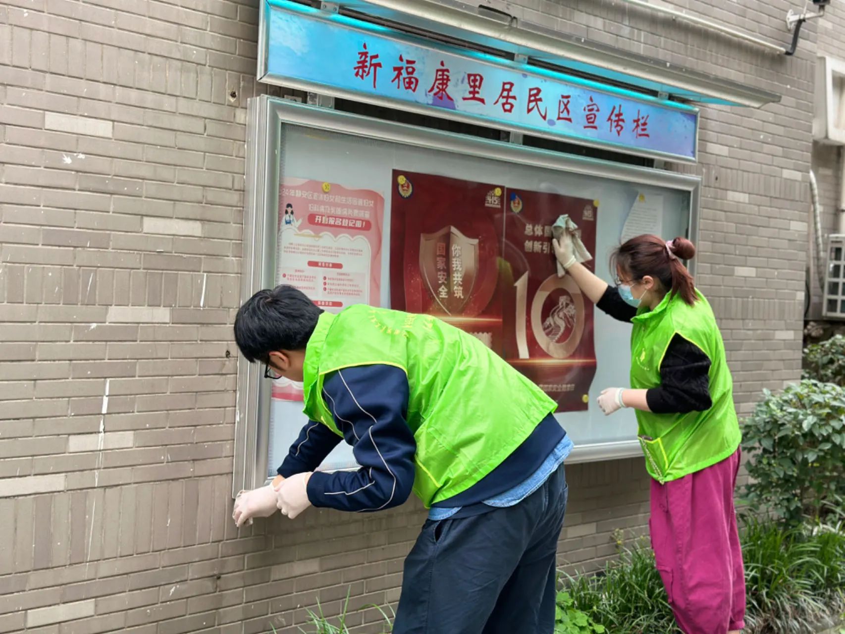 上海利隆的小伙伴们擦拭着新闸路、武定路口及小区中央大道的宣传栏。