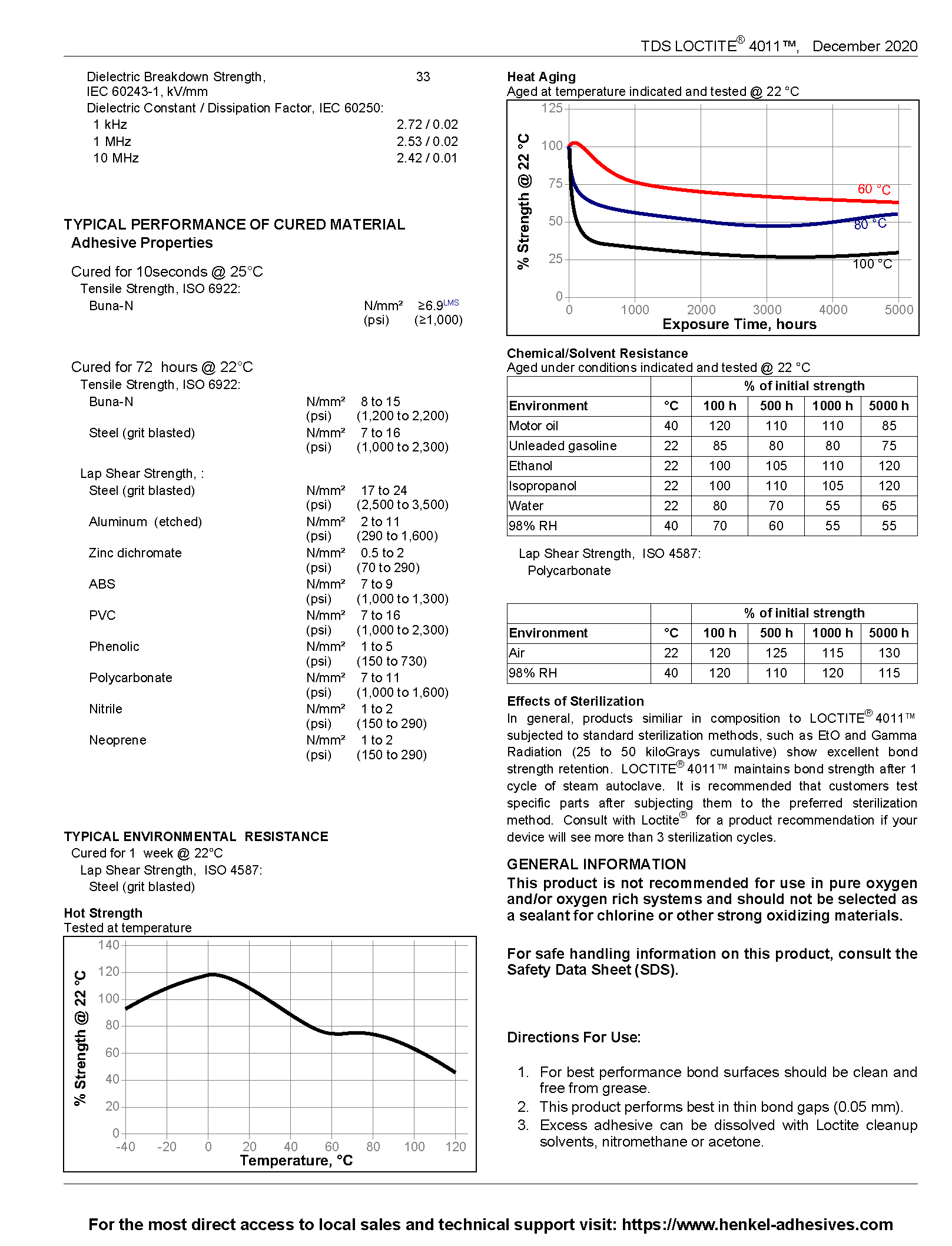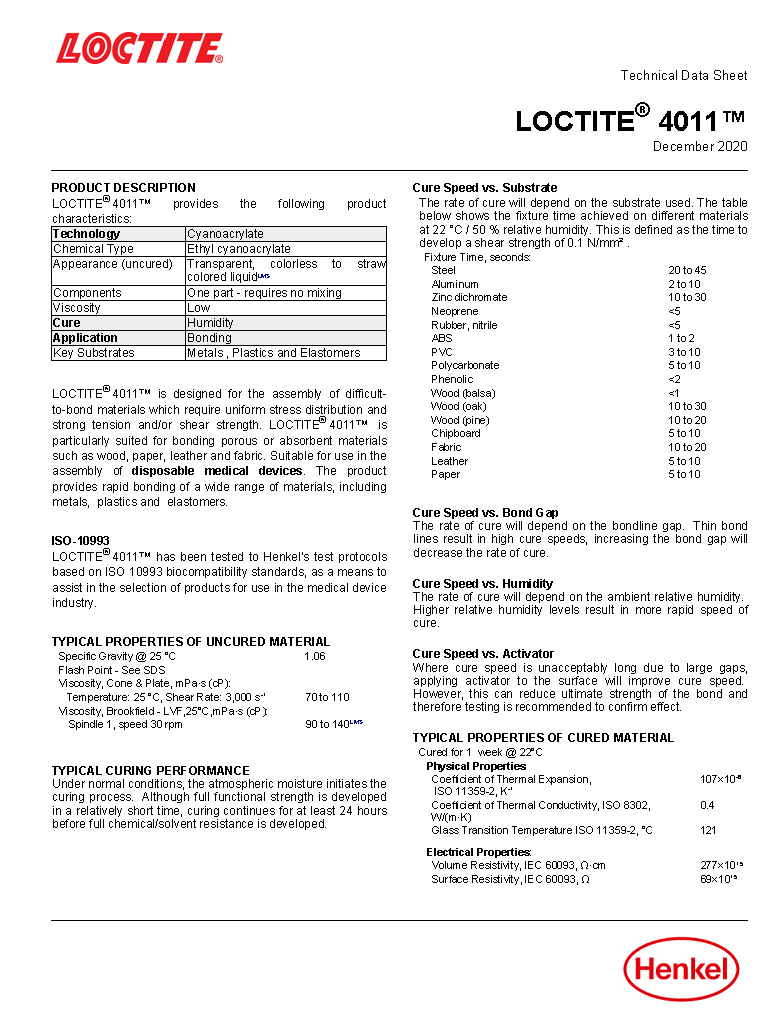 LOCTITE® 4011是一种低粘度、含乙基瞬干胶,用于组装要求均匀应力分布和较高拉伸和/或剪切强度的难以粘接材料。该ISO 10993认证产品非常适合用于多孔或酸性基材,如木材、纸张、皮革和织物,还可以粘接塑料、橡胶和金属。
