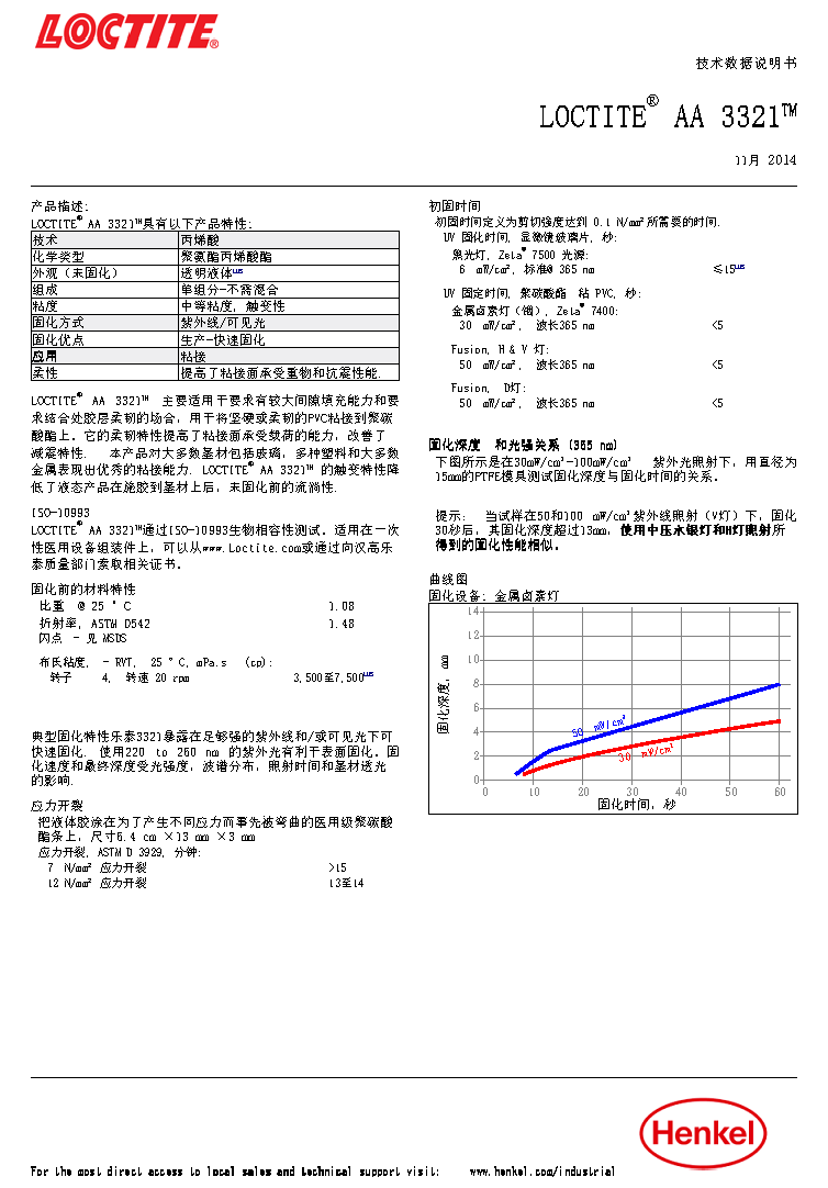 LOCTITE® AA 3321是一种透明、淡黄色、通用型光固化丙烯酸酯胶粘剂,适用于要求快速固化的金属和应力敏感塑料。固化深度大于13 mm,表干时间大于30秒。初固时间为12秒。邵氏硬度:D 53。高粘度:5,500 mPa·s。通过ISO 10993认证。