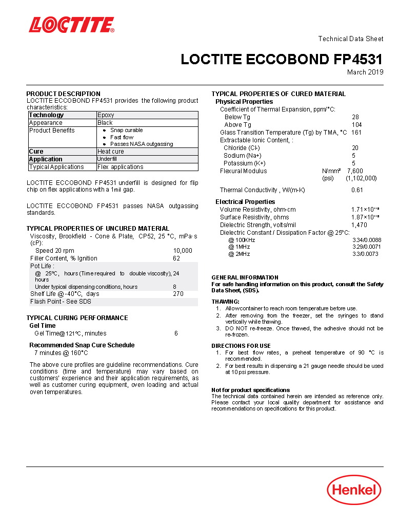 LOCTITE ECCOBOND FP4531 underfill is designed for flip chip on flex applications with a 1mil gap.