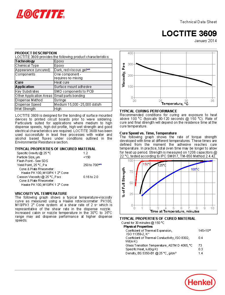 LOCTITE® 3609 是一种深红色黏稠的环氧凝胶,适用于在波峰焊前,将表面贴装的元器件粘接到印刷电路板上的应用。它特别适用于需要中高点胶速度、高精度胶点规格、高湿强度和良好电气特性的应用。性的应用。