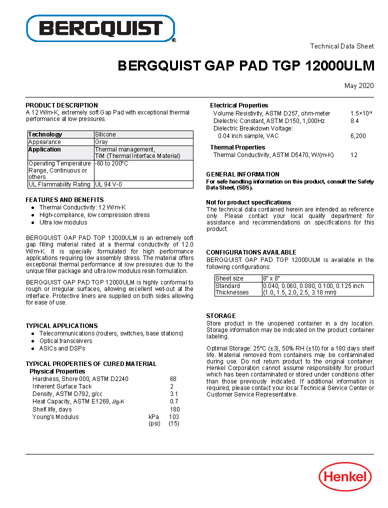 是为解决高度集成化通信设备及大规模数据中心的高热流密度研发的一款产品,是一款高导热、超低模量的界面导热垫片(PAD),非常适合现代的数据通信应用。在目前市场上高性能TIM产品之中,GAP PAD TGP 12000ULM 实现了高达12.0W/m-K的导热系数与超柔性,确保出色的界面湿润性能,以优化导热性能、实现低装配应力。