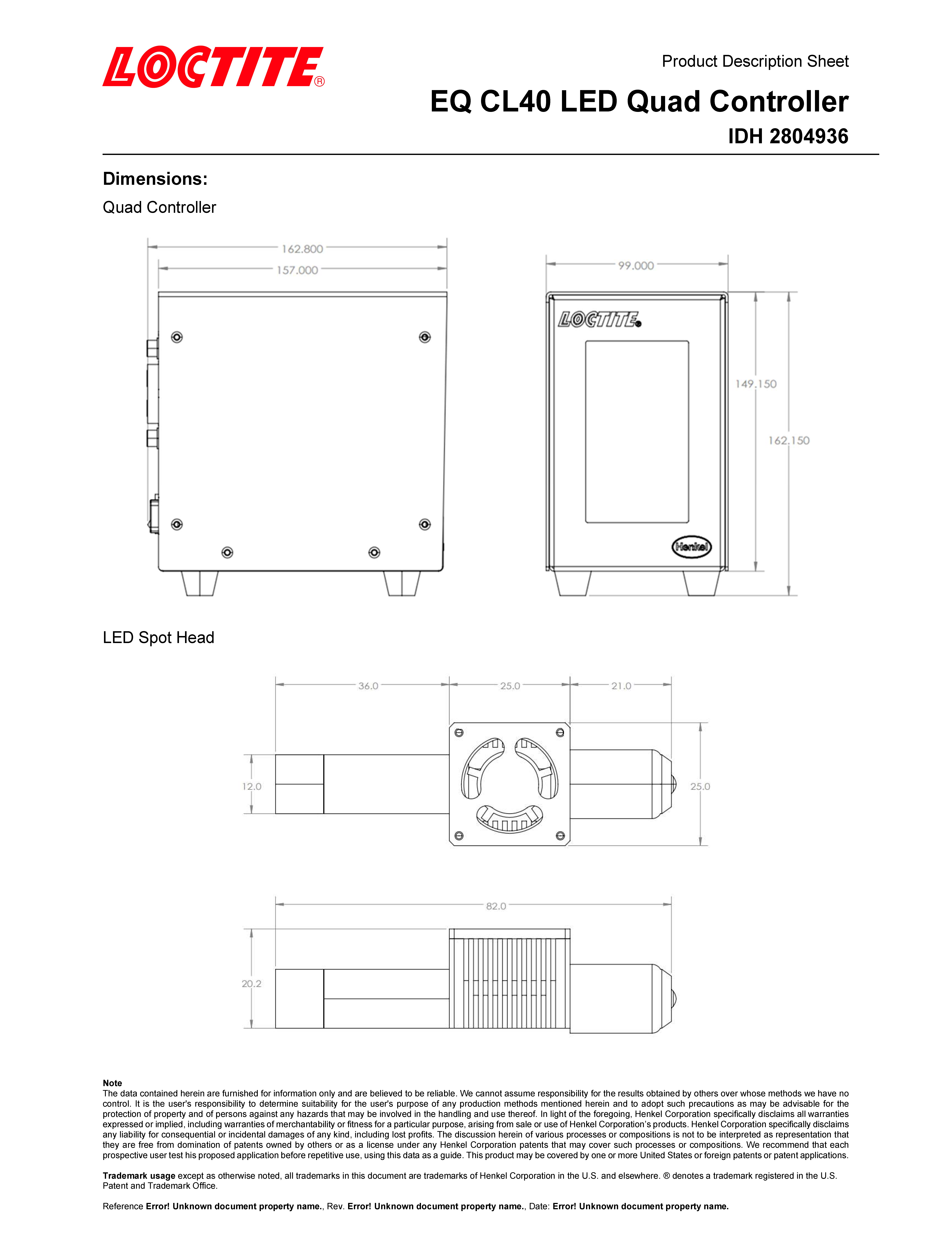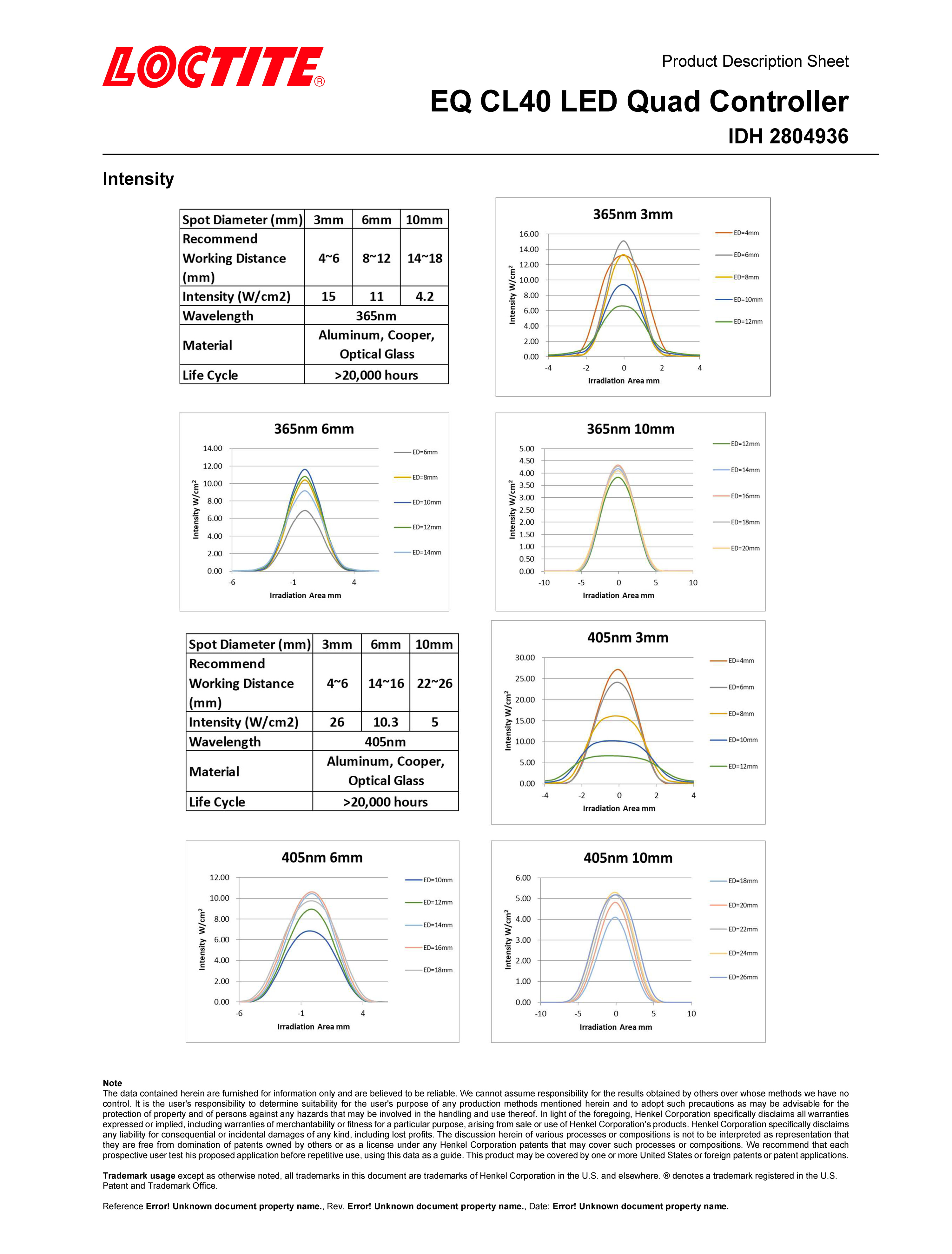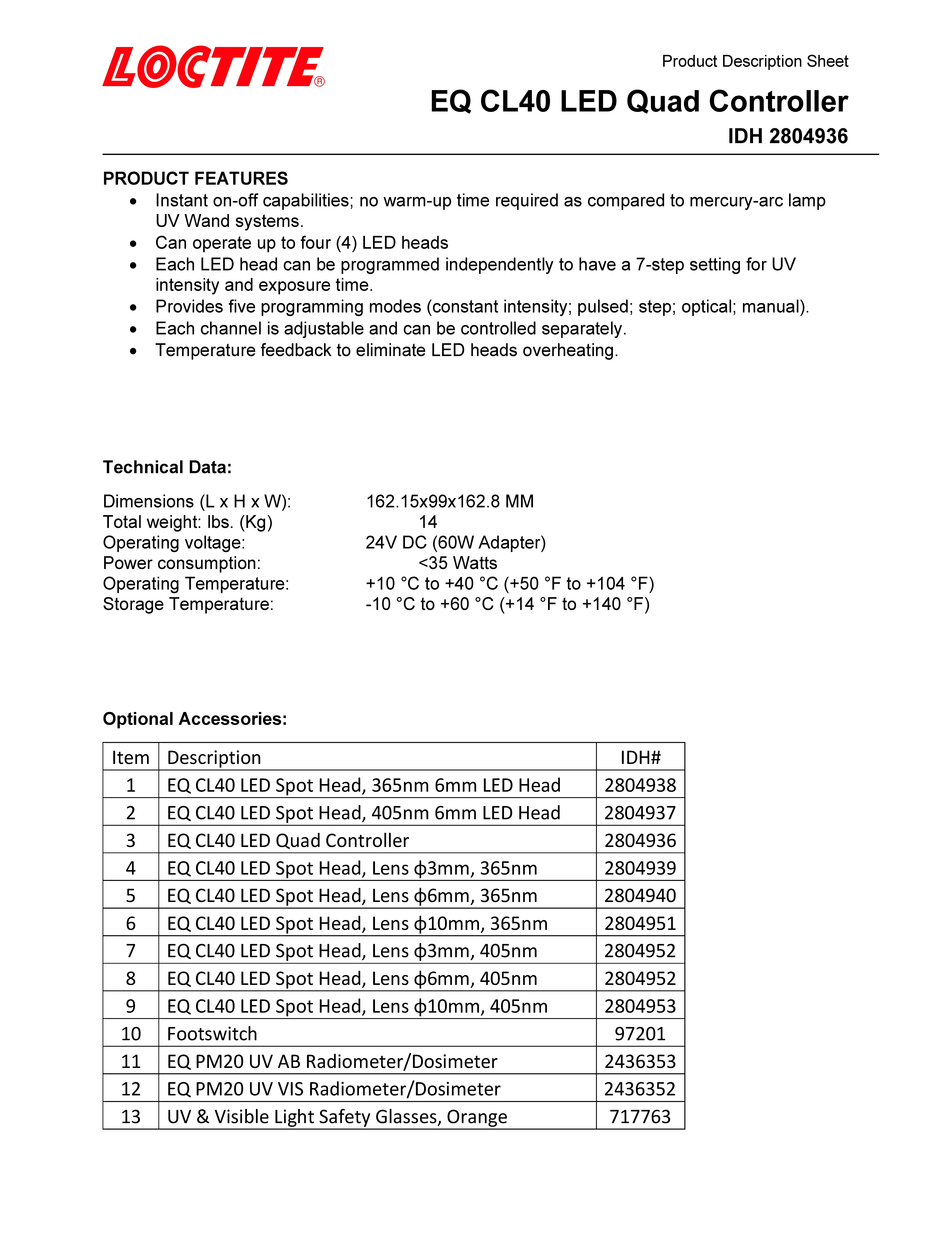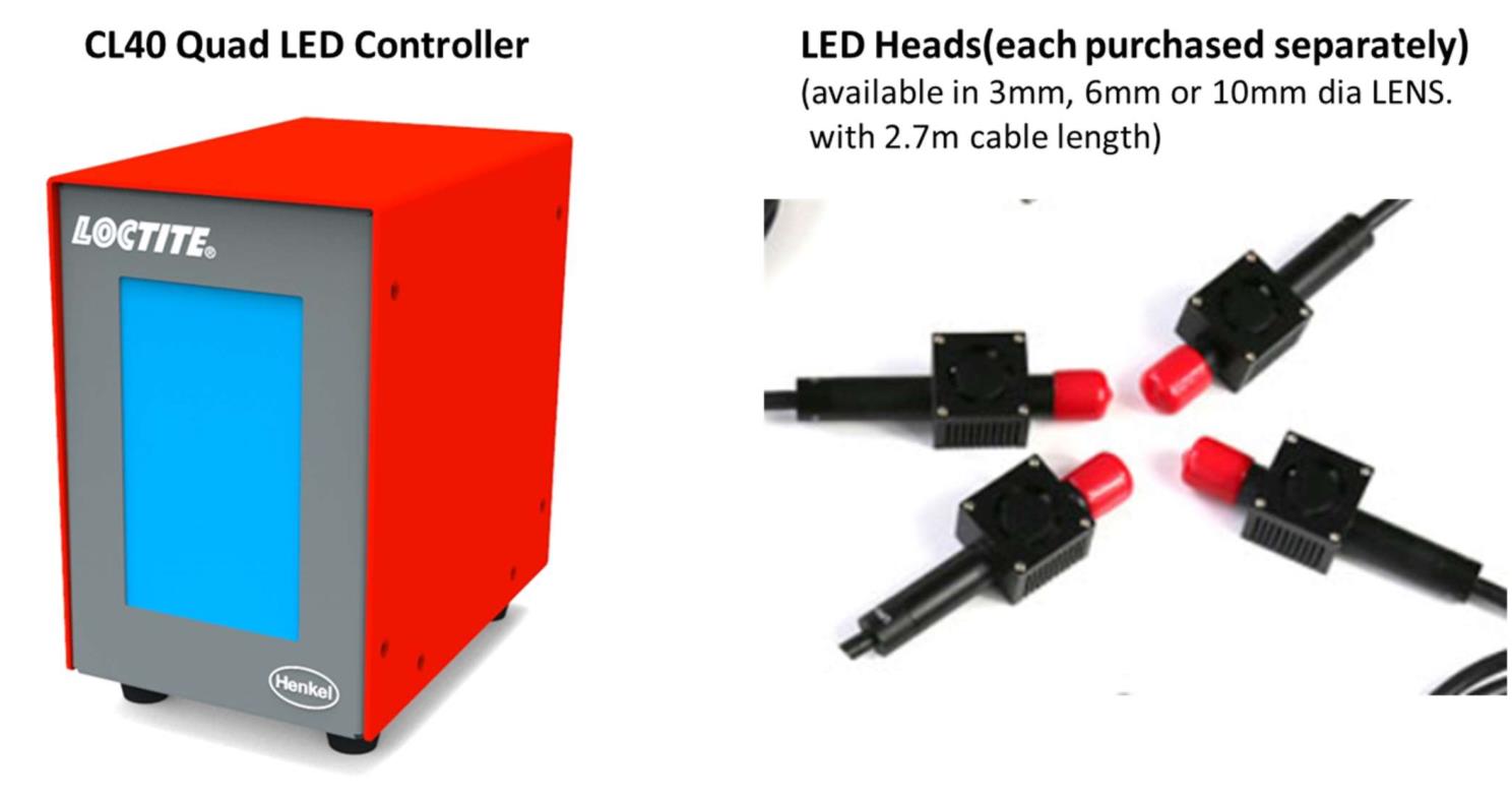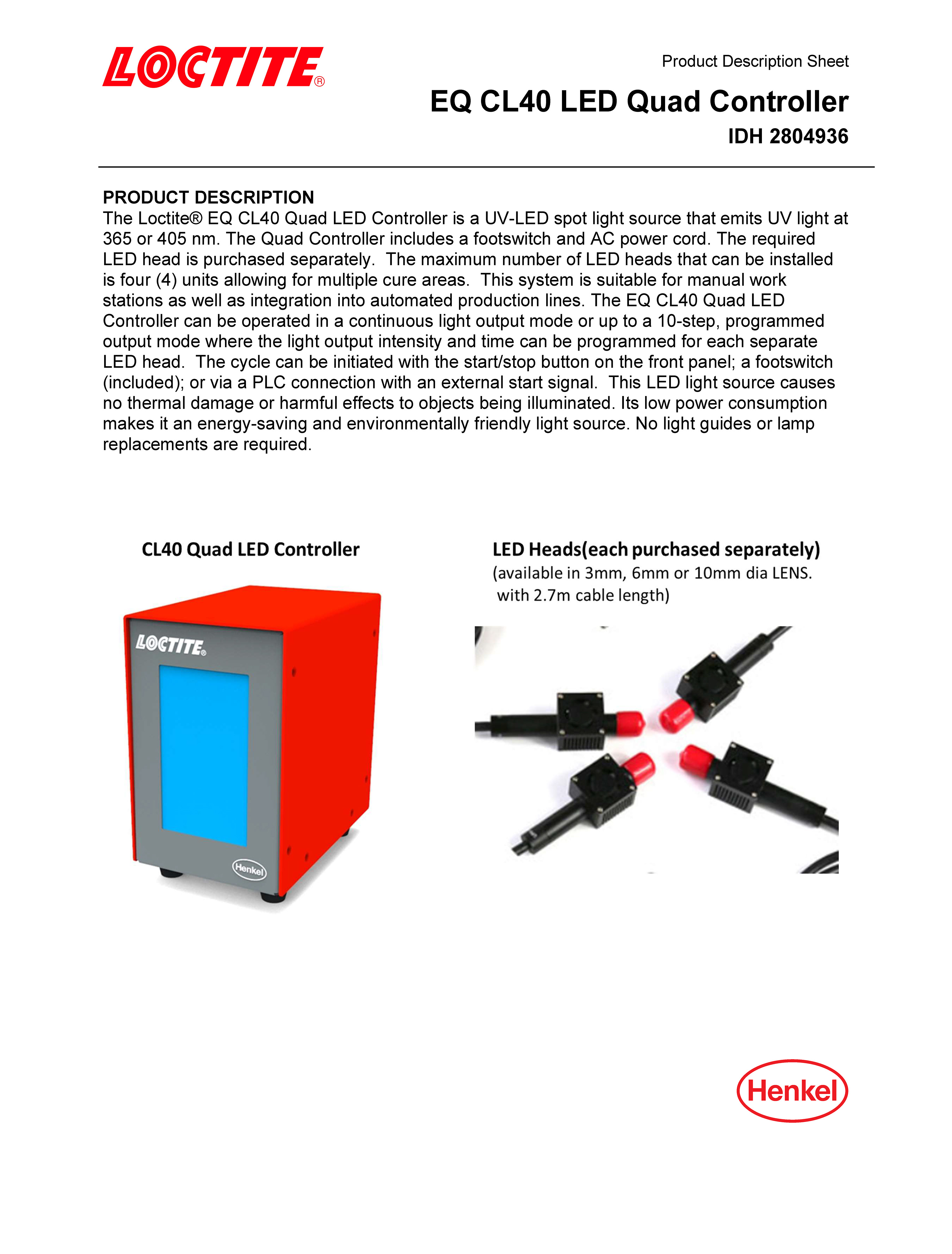 The Loctite EQ CL40 Quad LED Controller is a UV-LED spot light source that emits UV light at 365 or 405 nm. The Quad Controller includes a footswitch and AC power cord. The required LED head is purchased separately. The maximum number of LED heads that can be installed is four (4) units allowing for multiple cure areas. This system is suitable for manual work stations as well as integration into automated production lines. The EQ CL40 Quad LED Controller can be operated in a continuous light output mode or up to a 10-step, programmed output mode where the light output intensity and time can be programmed for each separate LED head. The cycle can be initiated with the start/stop button on the front panel; a footswitch (included); or via a PLC connection with an external start signal. This LED light source causes no thermal damage or harmful effects to objects being illuminated. Its low power consumption makes it an energy-saving and environmentally friendly light source. No light guides or lamp replacements are required.