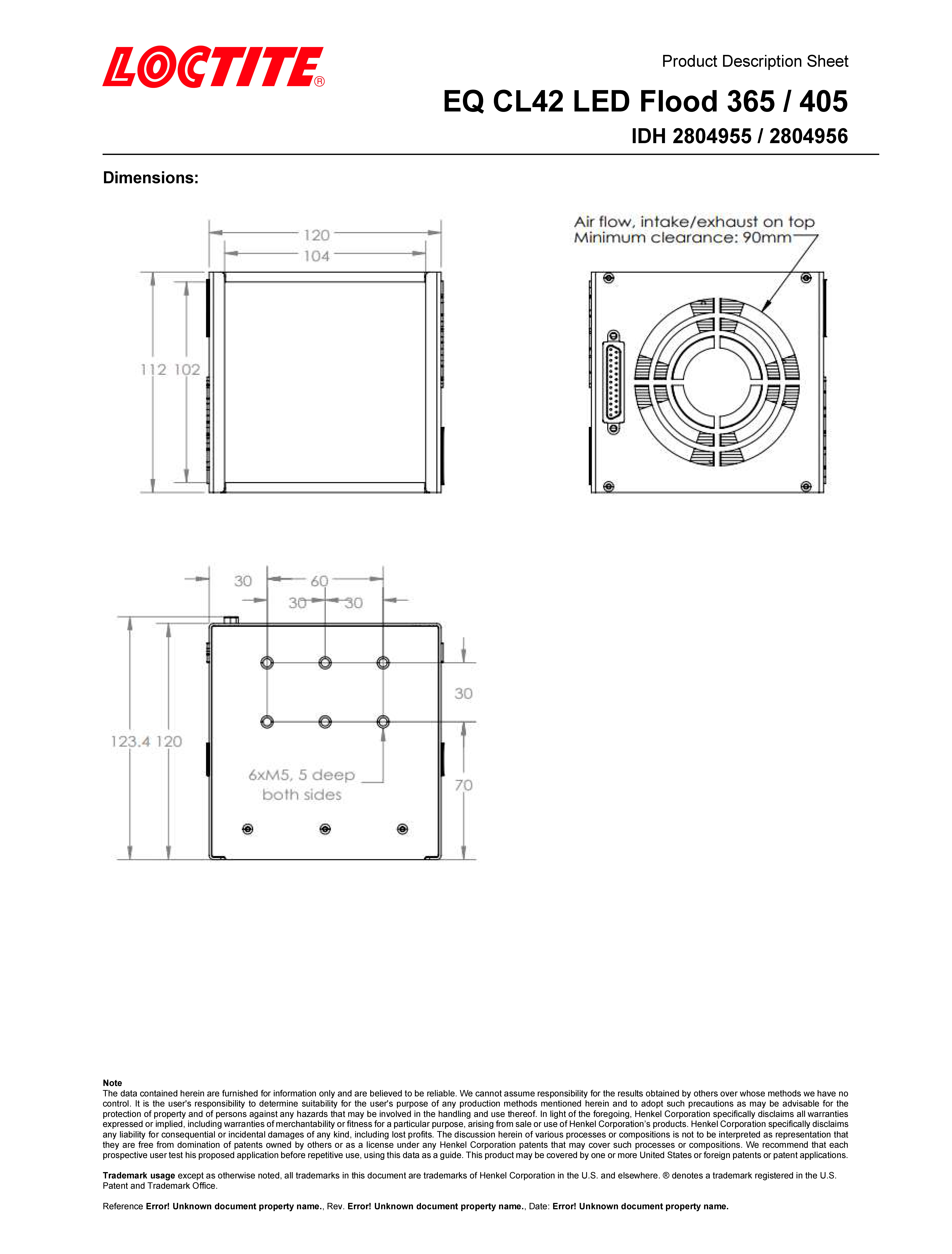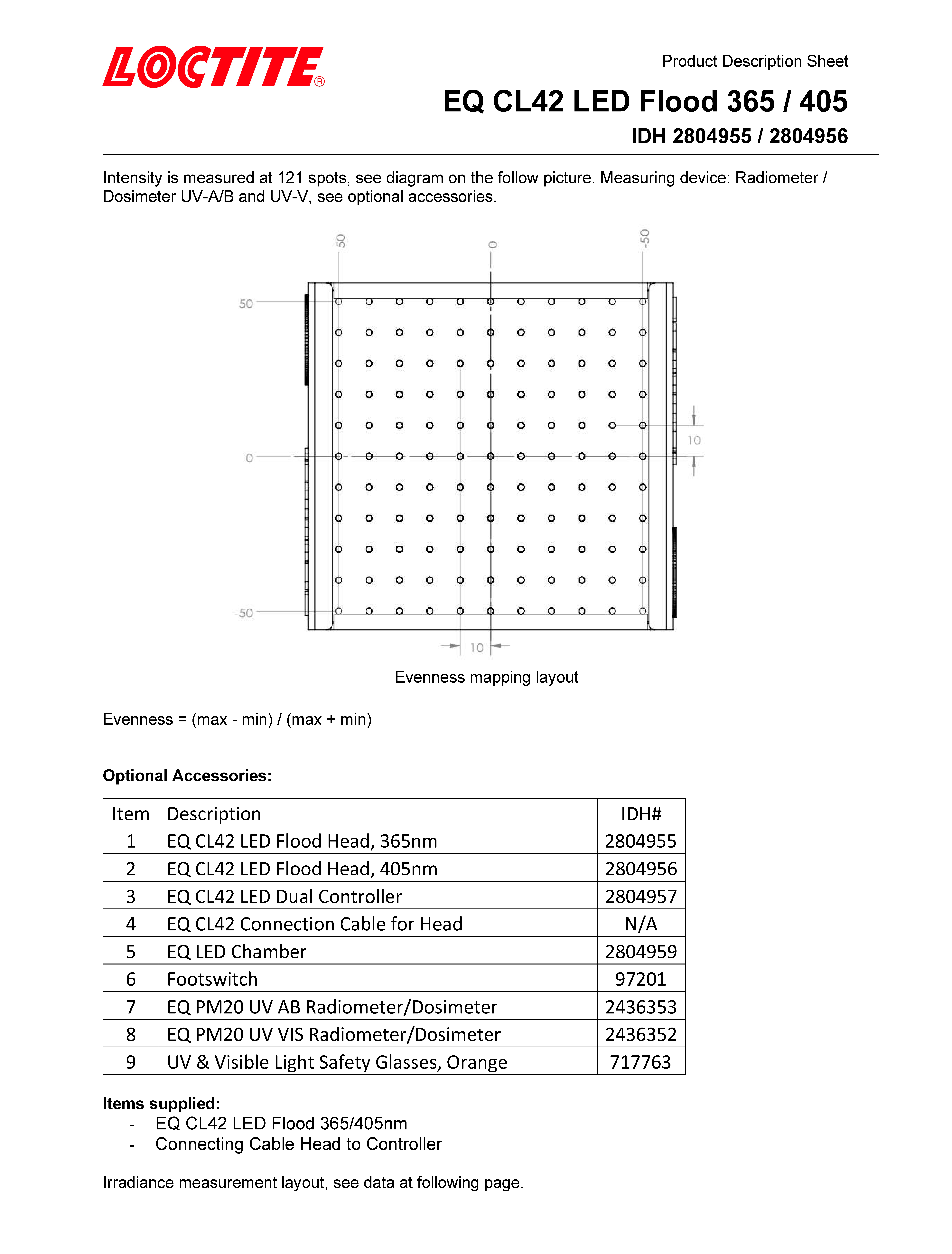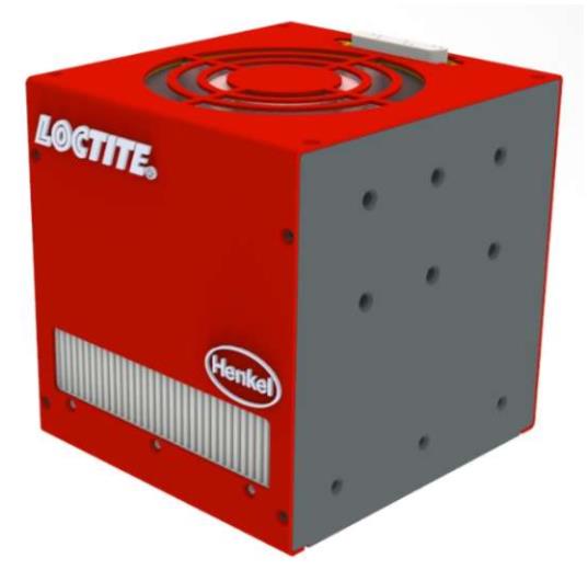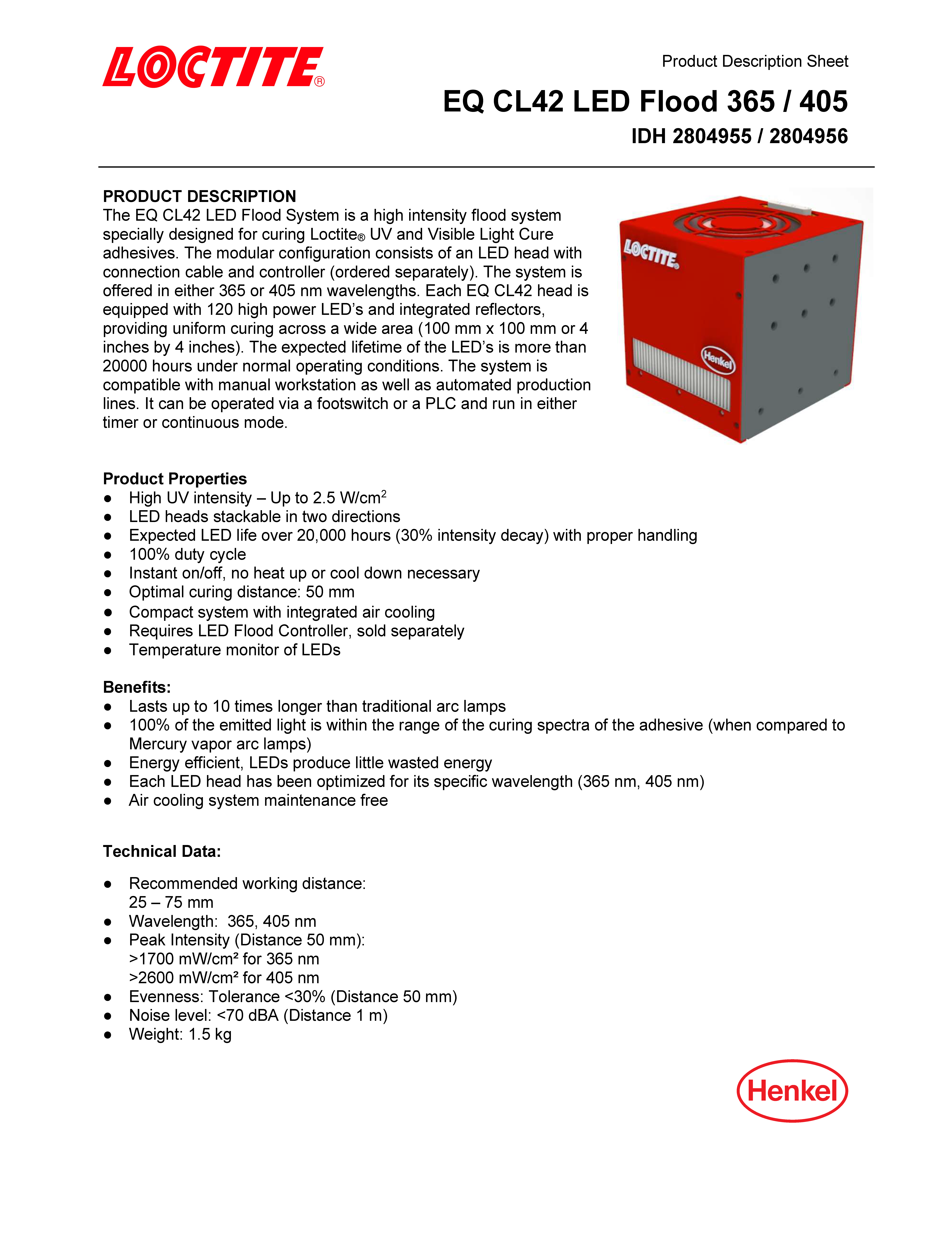 The EQ CL42 LED Flood System is a high intensity flood system specially designed for curing Loctite UV and Visible Light Cure adhesives. The modular configuration consists of an LED head with connection cable and controller (ordered separately). The system is offered in either 365 or 405 nm wavelengths. Each EQ CL42 head is equipped with 120 high power LED’s and integrated reflectors, providing uniform curing across a wide area (100 mm x 100 mm or 4 inches by 4 inches). The expected lifetime of the LED’s is more than 20000 hours under normal operating conditions. The system is compatible with manual workstation as well as automated production lines. It can be operated via a footswitch or a PLC and run in either timer or continuous mode.