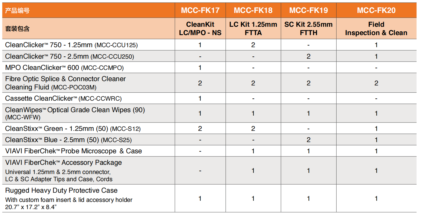 - 1 贴纸清洁答题器™ 2.5mm 压力清洁工具,可执行 750 多次清洁,适用于超过 15 种类型的连接器。(PN: MCC-CCU250)